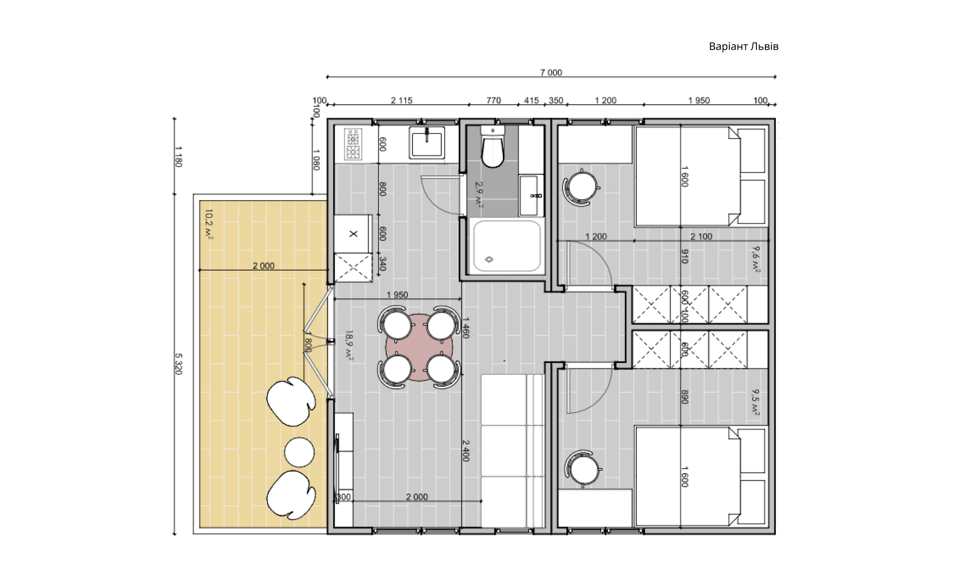 - Габарити: 7,0х6,5м + тераса 2,0х5,32м
