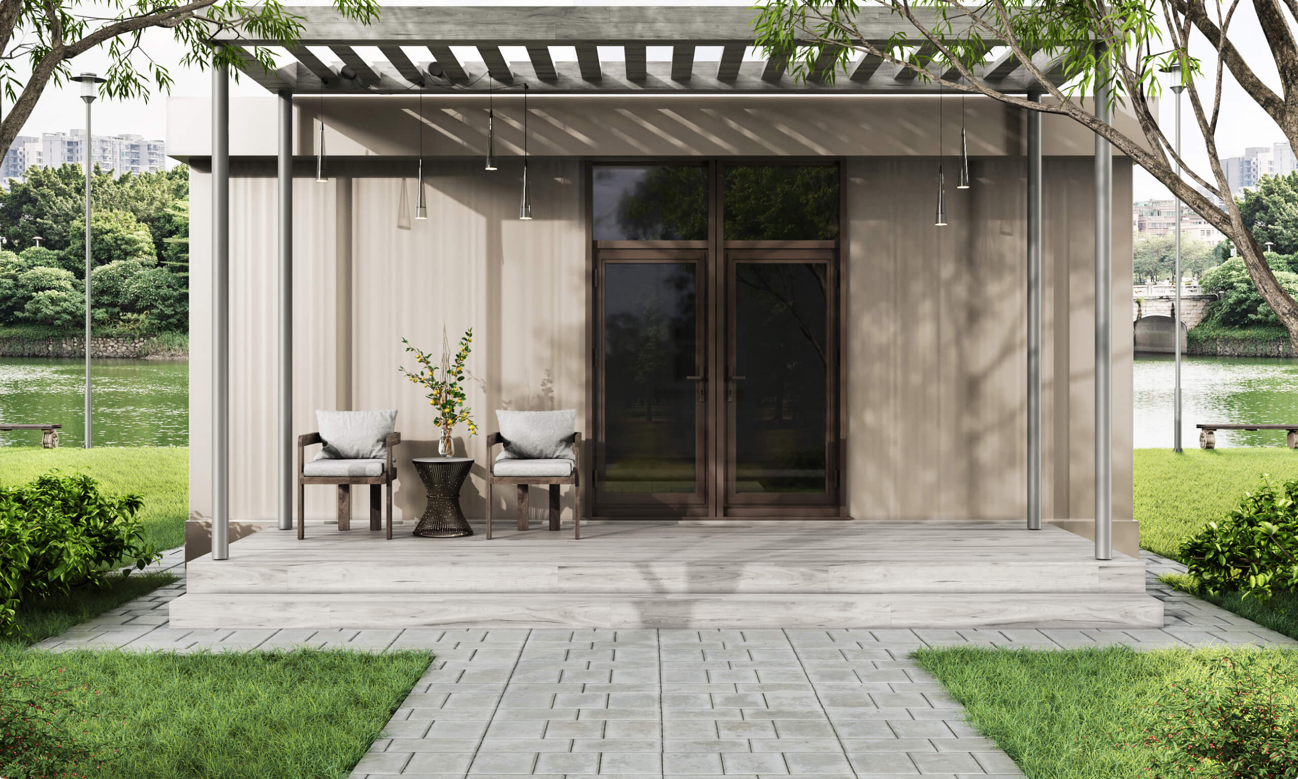- Зовнішнє оздоблення: вуличне освітлення, металевий сайдинг з декором